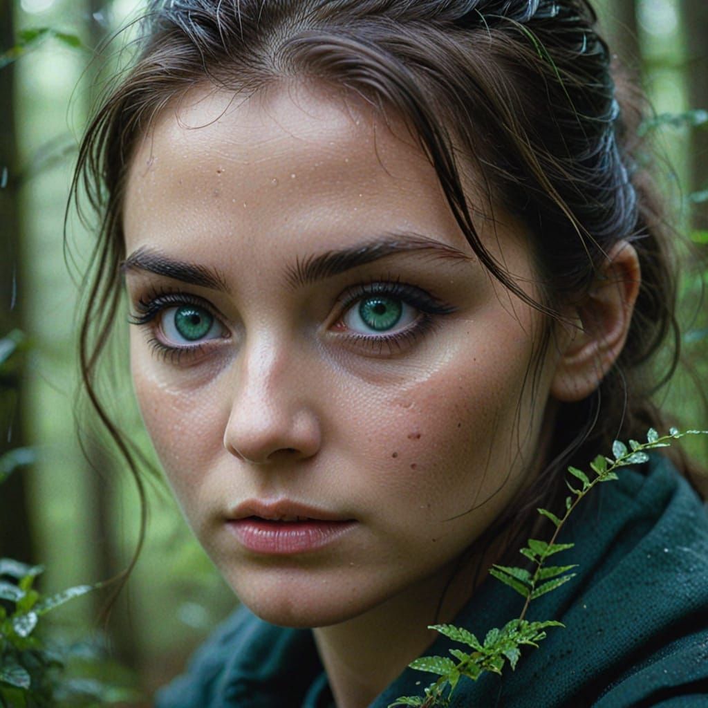 A cinematic film still of a pair of glowing emerald green eyes, shrouded in mist, creating an eerie and ominous atmosphere with film grain and vignette, set against a muted green and blue palette.
