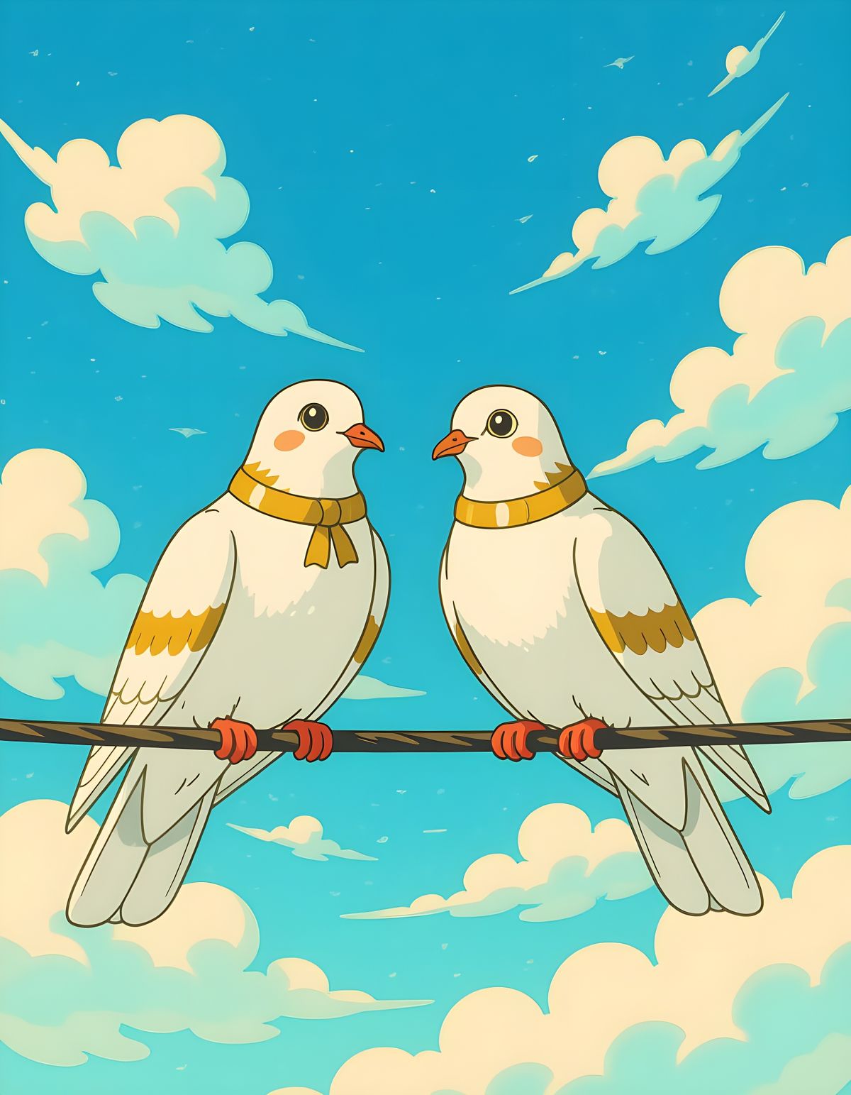 This image shows two doves perched on a wire against a bright blue sky. Fluffy white clouds accent the scene, rendered in a warm, nostalgic vintage anime style.