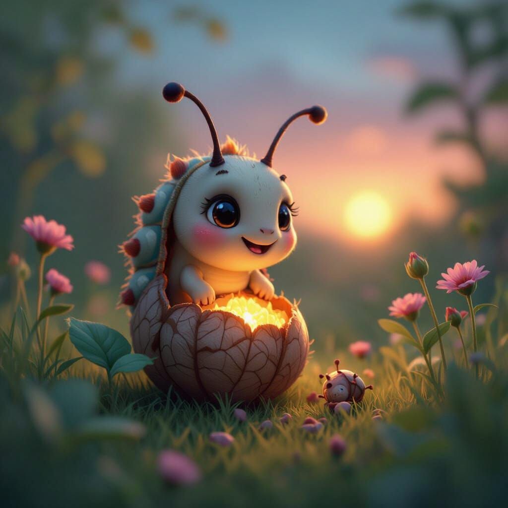This image shows an animated Hyalophora cecropia caterpillar emerging from its cocoon at dusk. Surrounded by warm orange and pink hues, it nibbles on a dandelion leaf in an impasto style.