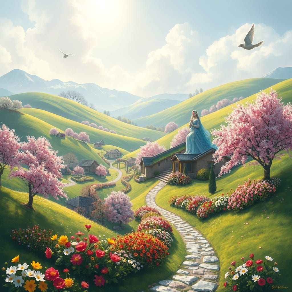 This serene image depicts a picturesque springtime village set amidst rolling hills, adorned with cherry blossoms and colorful flowers, under a warm and gentle sunlight, evoking a sense of peacefulness and tranquility, reminiscent of Thomas Kinkade's style