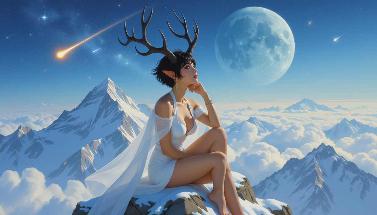 A striking image of a red-eyed tiefling maiden with antlers, admiring a sky filled with stars and comets from a snowy mountain peak, rendered in a dramatic, painterly style.