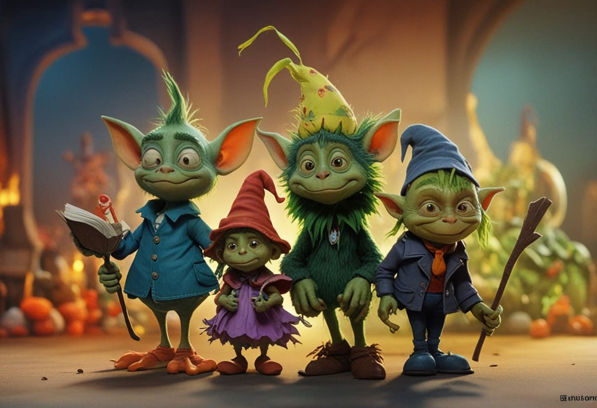 This enchanting image showcases a group of goblin friends in a vibrant, photorealistic fantasy world, blending the whimsy of Dr. Seuss and Jim Henson with the visual grandeur of Studio Ghibli.