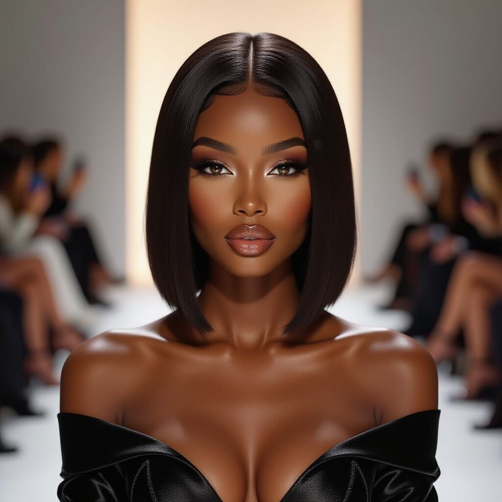 This image features a photorealistic AI influencer with deep brown skin, styled hair, and hazel eyes, elegantly seated at a fashion show. It captures a sophisticated lifestyle vibe with cinematic lighting.