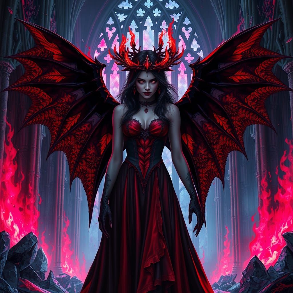 This image shows a gothic vampire queen with bat wings standing in cathedral ruins. Shattered glass and crimson eyes evoke tragic beauty in a dark fantasy aesthetic.