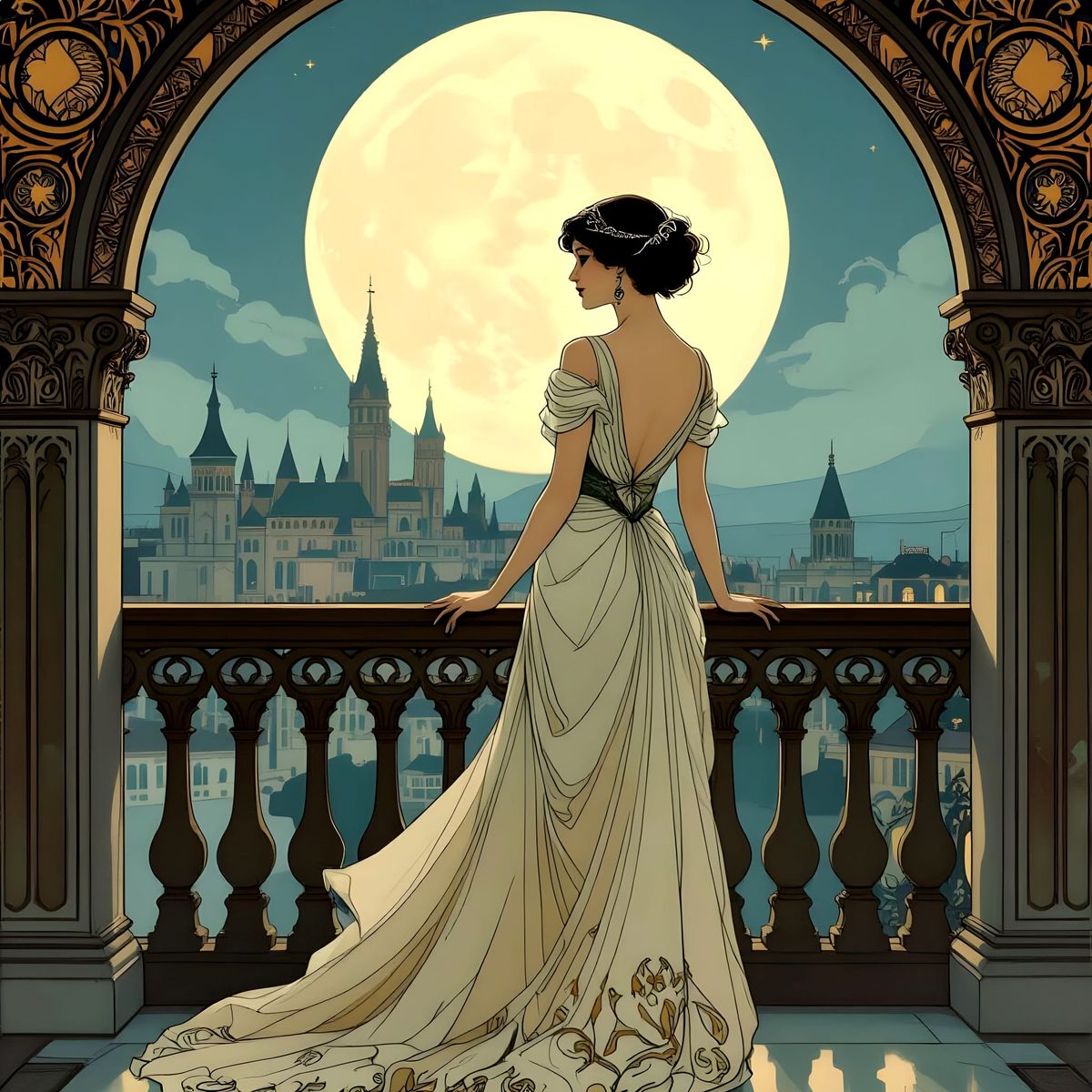 This image depicts an elegant woman in an Art Nouveau gown on a balcony, gazing at a moonlit fantasy kingdom. It features soft, flowing lines and a muted color palette, evoking a sense of quiet contemplation.