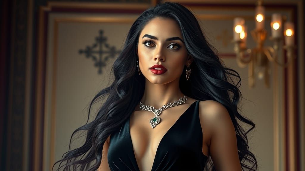 A striking portrait of a beautiful sorceress movie star. She is wearing a black velvet gown, captured with hyper-detailed textures and soft lighting in a Parisian art-deco studio. The artistic style includes digital glitch art.