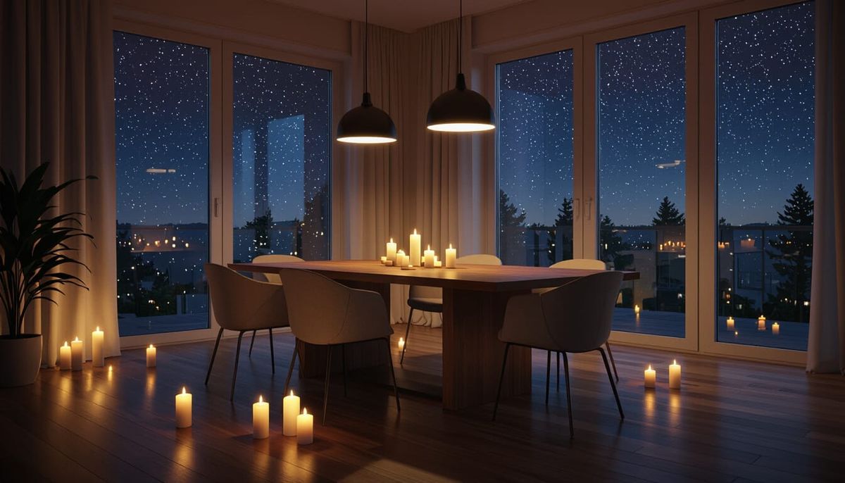 This image shows a modern dining room interior bathed in soft, warm light. A wooden table, minimalist chairs, and candles create a cozy scene, with a starry night visible through the windows as 3d rendered digital art.