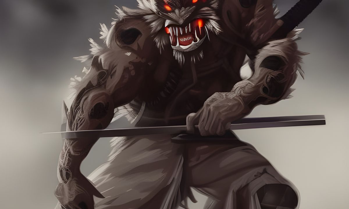 This image shows a Ninja Oni Samurai transforming into an empowered werewolf. The artwork is a cinematic digital painting with dramatic and intricate details.