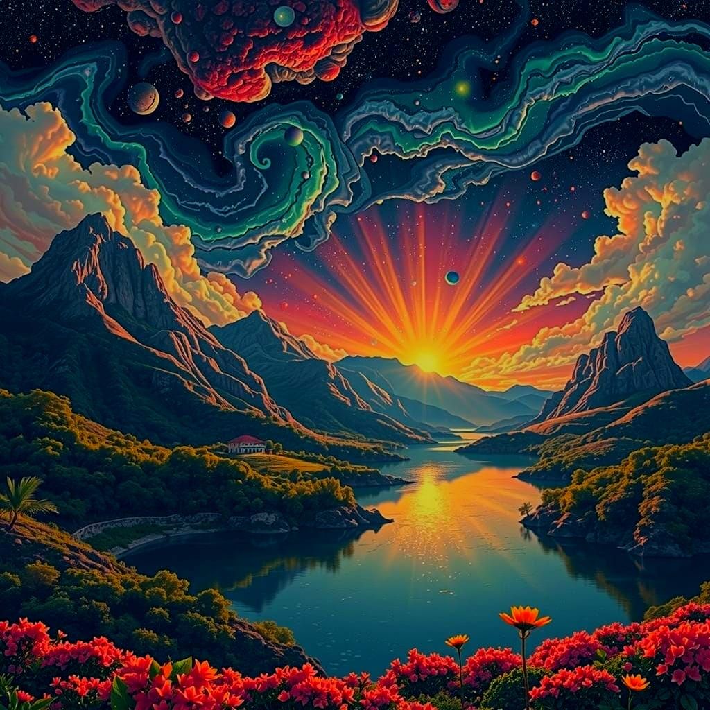 This image displays a vibrant pattern of fertile lands, shimmering mountains, and glowing lifeforms under a swirling nebulae sky with a liquid opal backdrop. Prismatic light illuminates a fantastical panorama.
