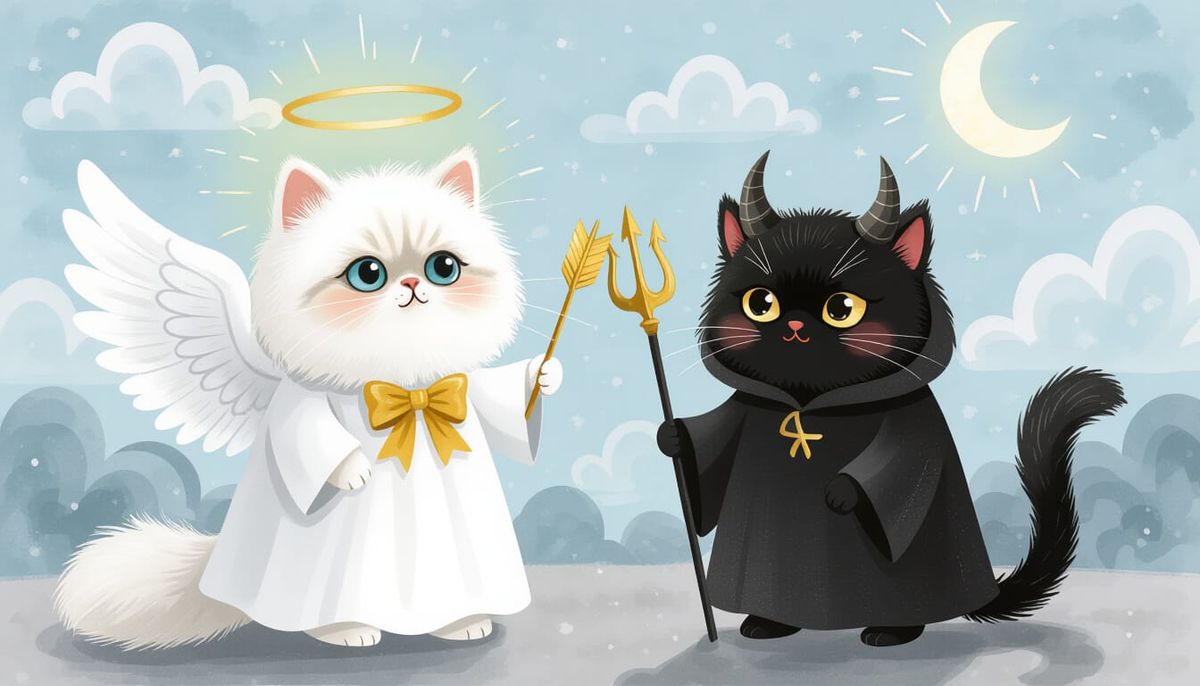 This image shows a white Persian cat dressed as an angel with golden halo and wings, holding a bow and arrow, standing beside a black cat dressed as a devil against a cloudy sky with sun and moonlight, in watercolour style.