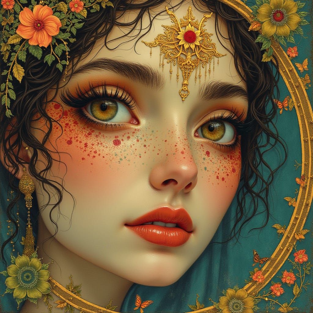 This image shows a beautiful woman surrounded by an ethereal green foliage, in a style that blends art nouveau and fantasy elements, evoking a sense of mysticism and wonder