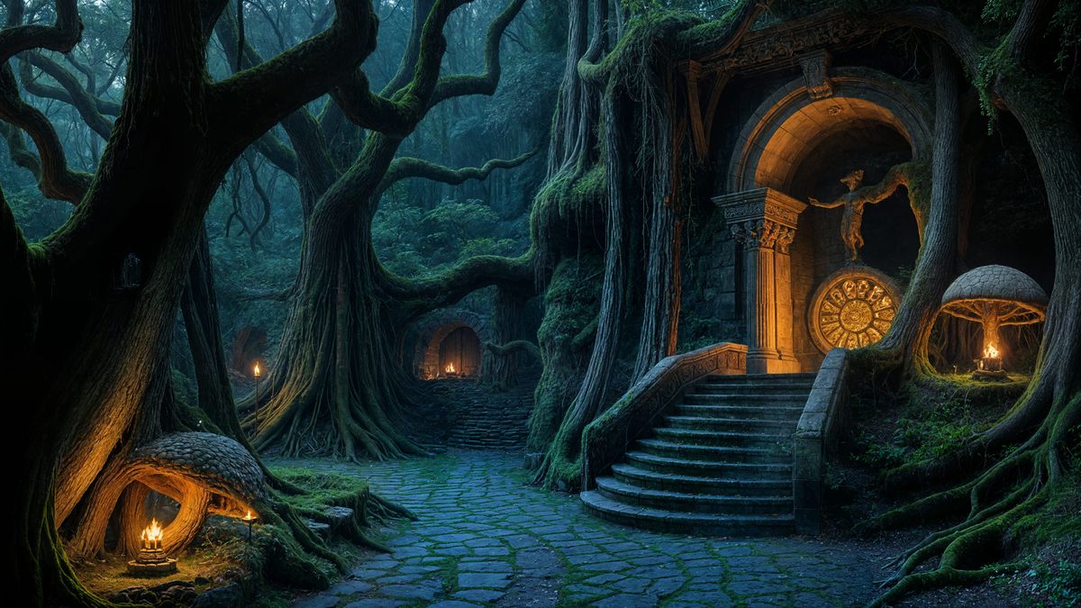 A captivating view of a dark fantasy forest at night, featuring ancient trees, glowing moss, and bioluminescent flora. Ruins and a stone sanctuary enhance the magical atmosphere, rendered in a cinematic fantasy art style.