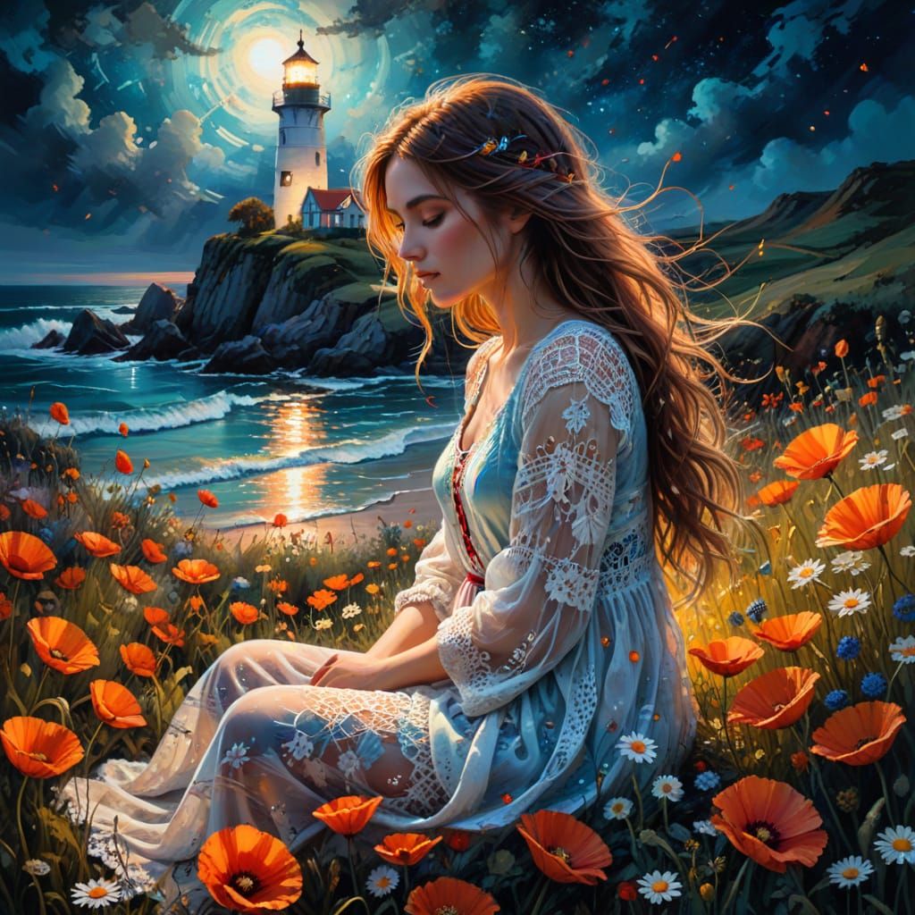 A vivid oil painting of a woman in a field of poppies and daisies, draped with a vibrant crochet blanket. The image features soft moonlight and bioluminescent waves in a magical, dreamy style.
