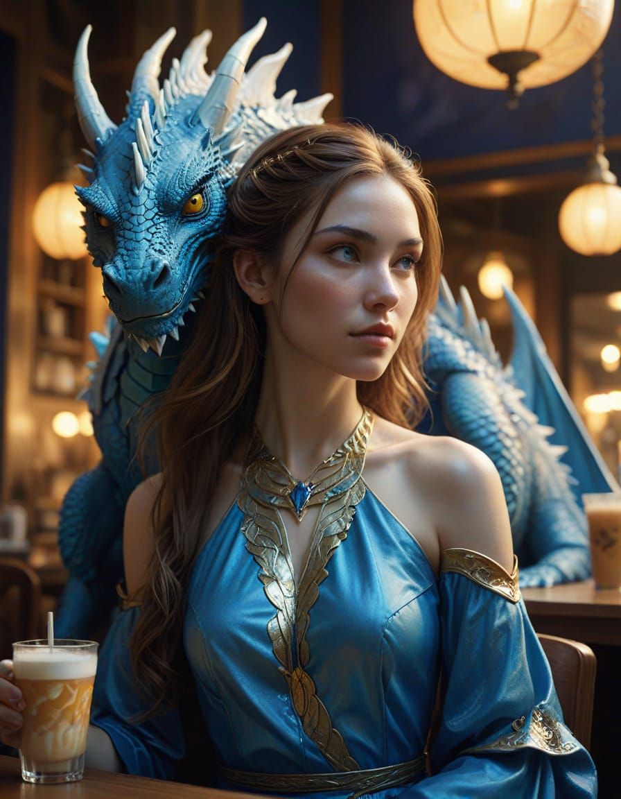 A cinematic portrait of a girl with long hair and a blue dress in a cafe, with a small white dragon on her shoulder. The image features warm colors, golden lighting, and a painterly style.