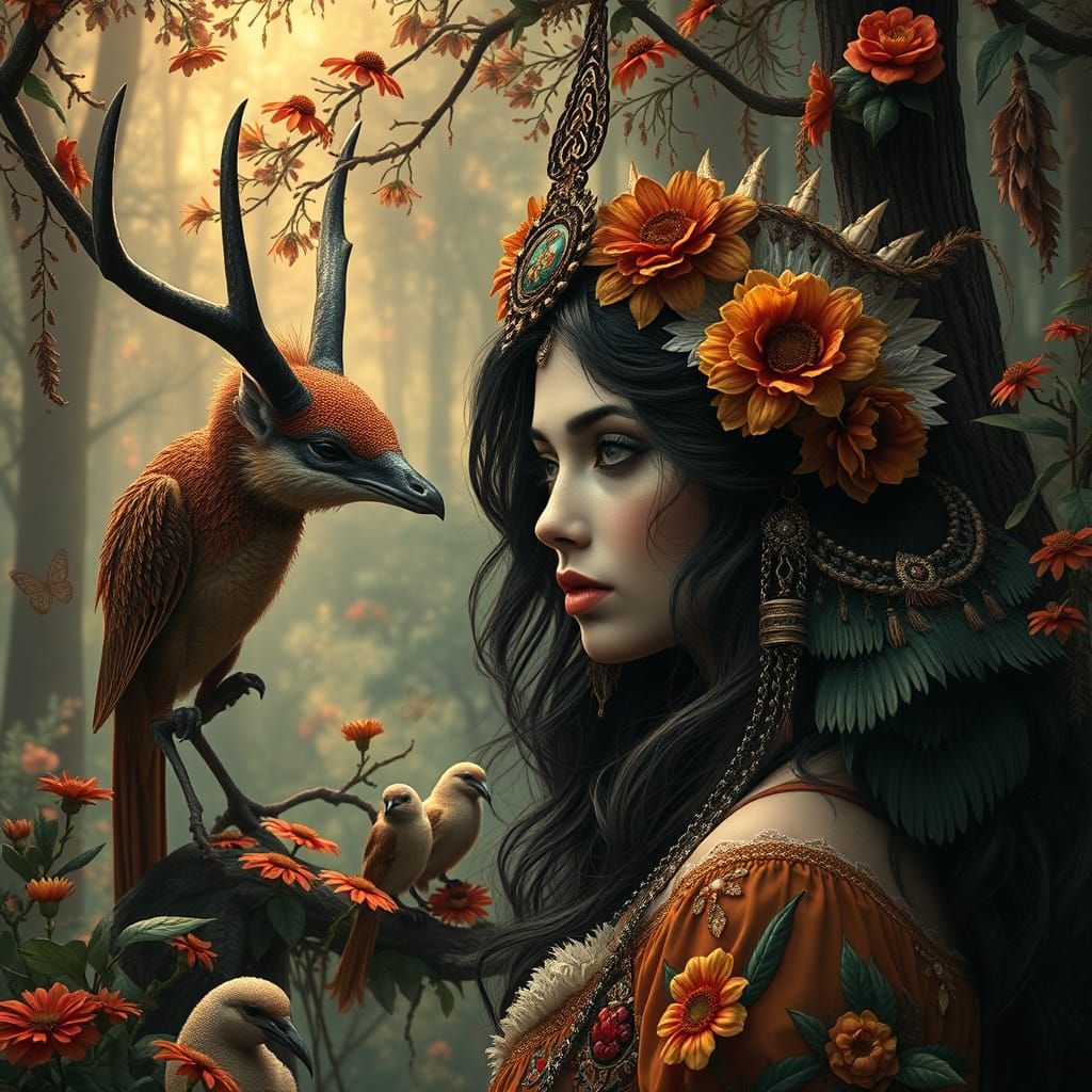 This enchanting image depicts a dreamlike landscape where woodland creatures and goddesses interact amidst intricate botanical details, ornate patterns, and vibrant colors, set against a richly colored background.