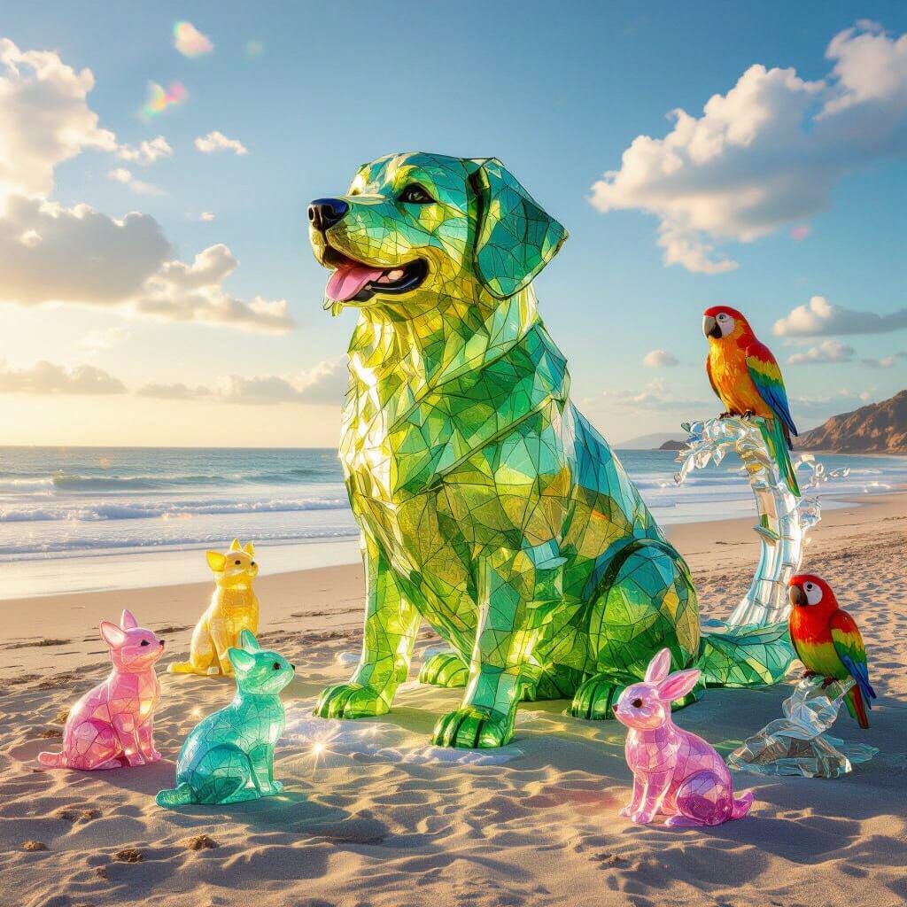 Experience the wonder of a magical shoreline where pets are sculpted from sea glass! πΎπ From a giant retriever glowing in emerald glass to kittens carved from cobalt shards, rabbits from pastel hues, and parrots shimmering in rainbow crystal trees, this enchanted sea glass pet park is a breathtaking blend of art, pets, and ocean beauty. Perfect for pet lovers who adore creativity and fantasy.
