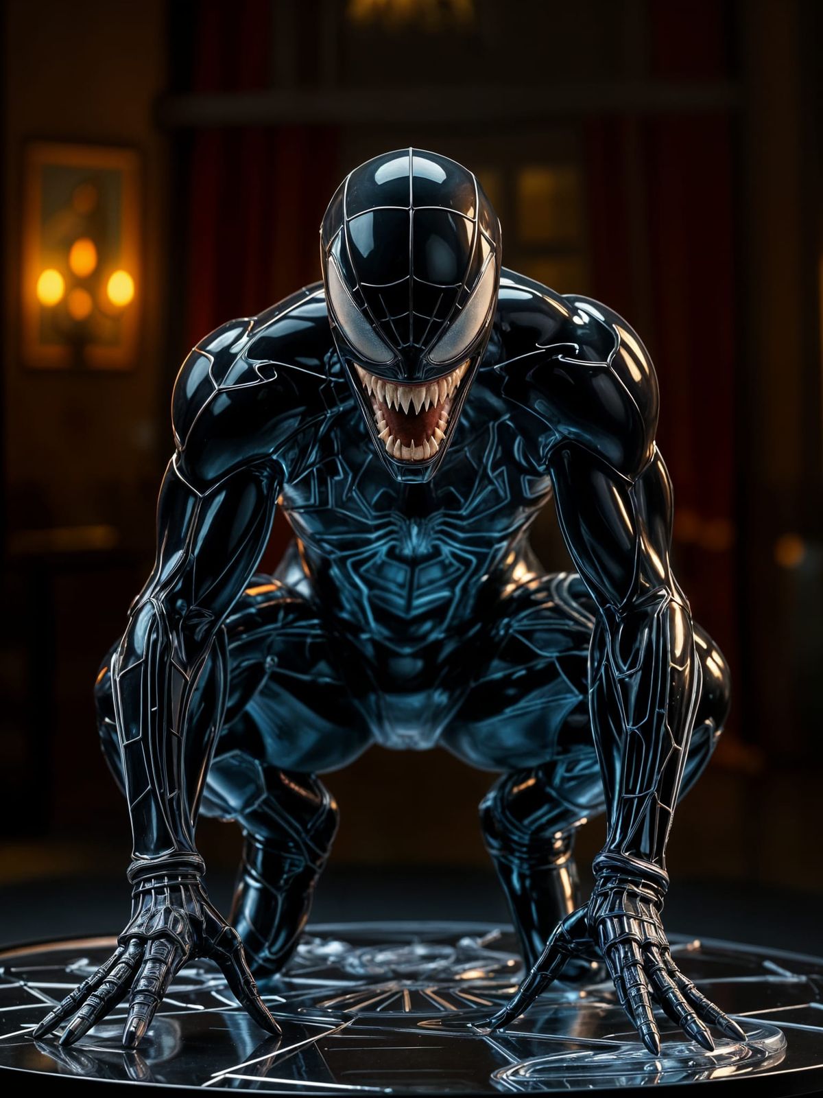 This image shows a sculpted glass Spiderman in the black Venom suit, posed in a crouch. The digital matte painting features volumetric lighting, complementary colors, and intricate details for a cinematic and dramatic effect.