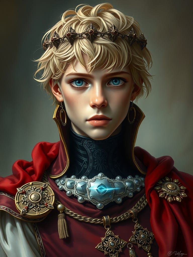A dramatic portrait of a blond prince with a cybernetic implant. The image blends classical realism with intricate details and a hint of darkness, reminiscent of atmospheric digital artwork.