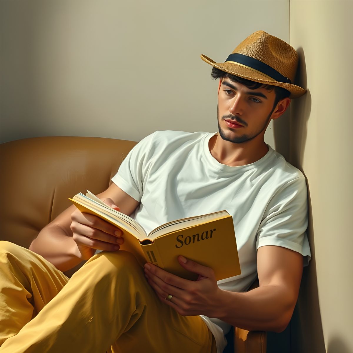A portrait of a young man wearing a hat and earring, engrossed in reading a bright yellow book with shiny silver lettering on the cover.