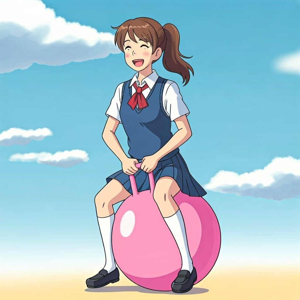 This image shows a young school girl in a playful pose, surrounded by vibrant colors and whimsical textures reminiscent of classic Ghibli animation. With a focus on subtle details and bright hues, this artwork captures a carefree moment in a fantastical world.