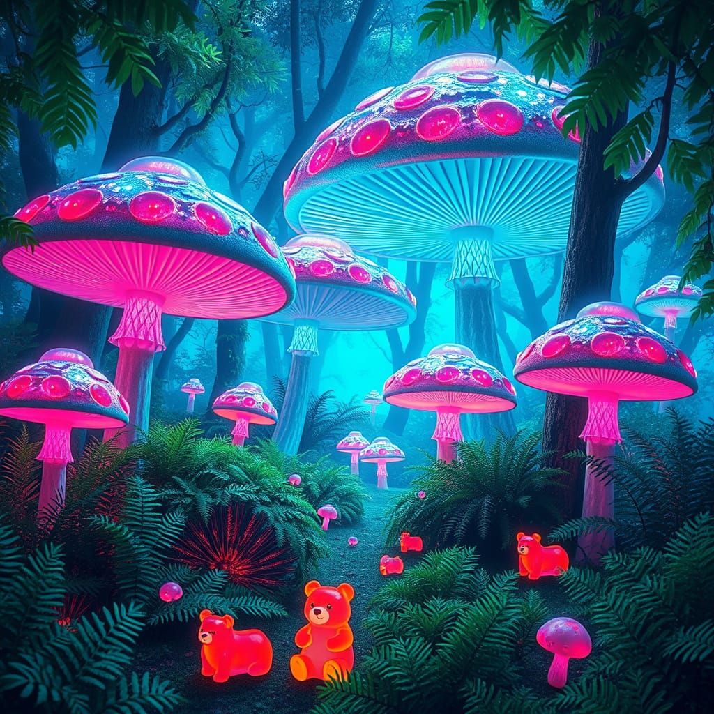 This image shows a vibrant, dreamlike forest filled with giant, glowing mushrooms and lush ferns, surrounded by scattered gummy bears and radiating electric blue and pink neon hues, reminiscent of fantastical worlds and futuristic cityscapes.