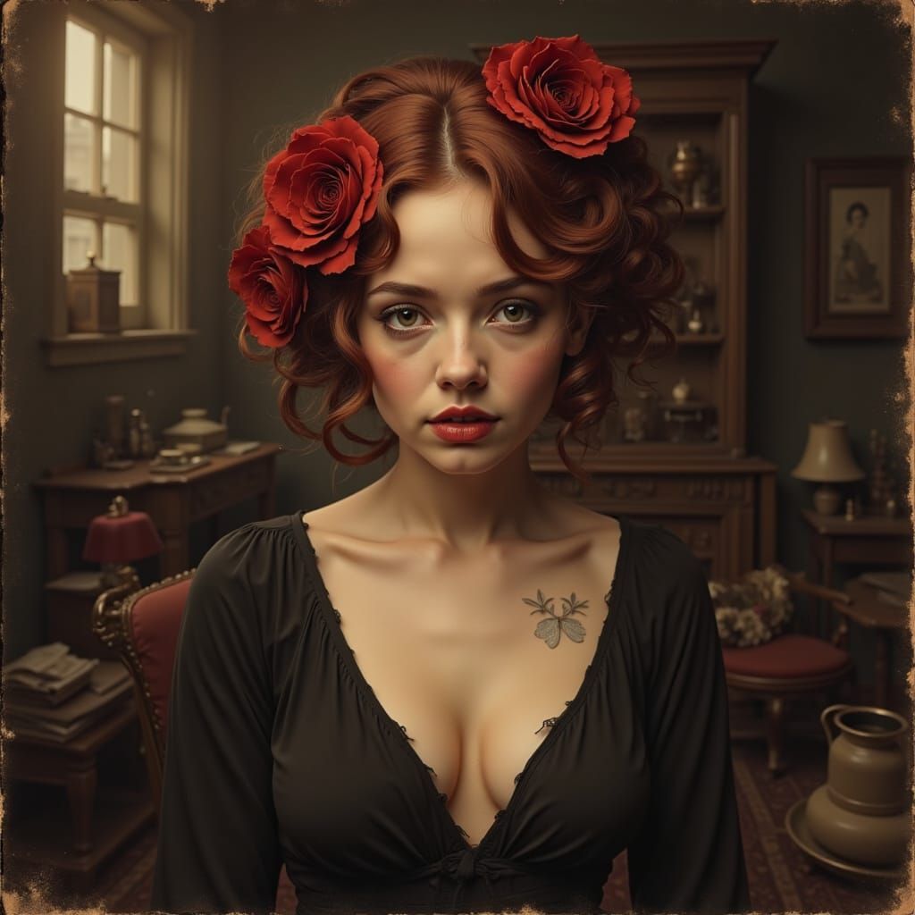 A hyperdetailed oil painting of a woman with a rose in her auburn hair, in a dimly lit antique interior. Features dramatic lighting and dynamic splash art elements.