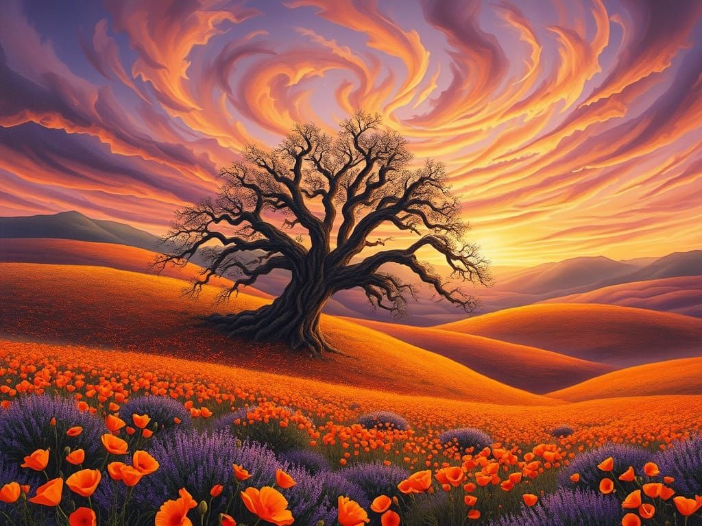 This image shows a dreamlike landscape with vibrant orange and purple flowers, a giant oak tree, and a swirling sky, captured in a detailed painting style reminiscent of impressionism and the Hudson River School.