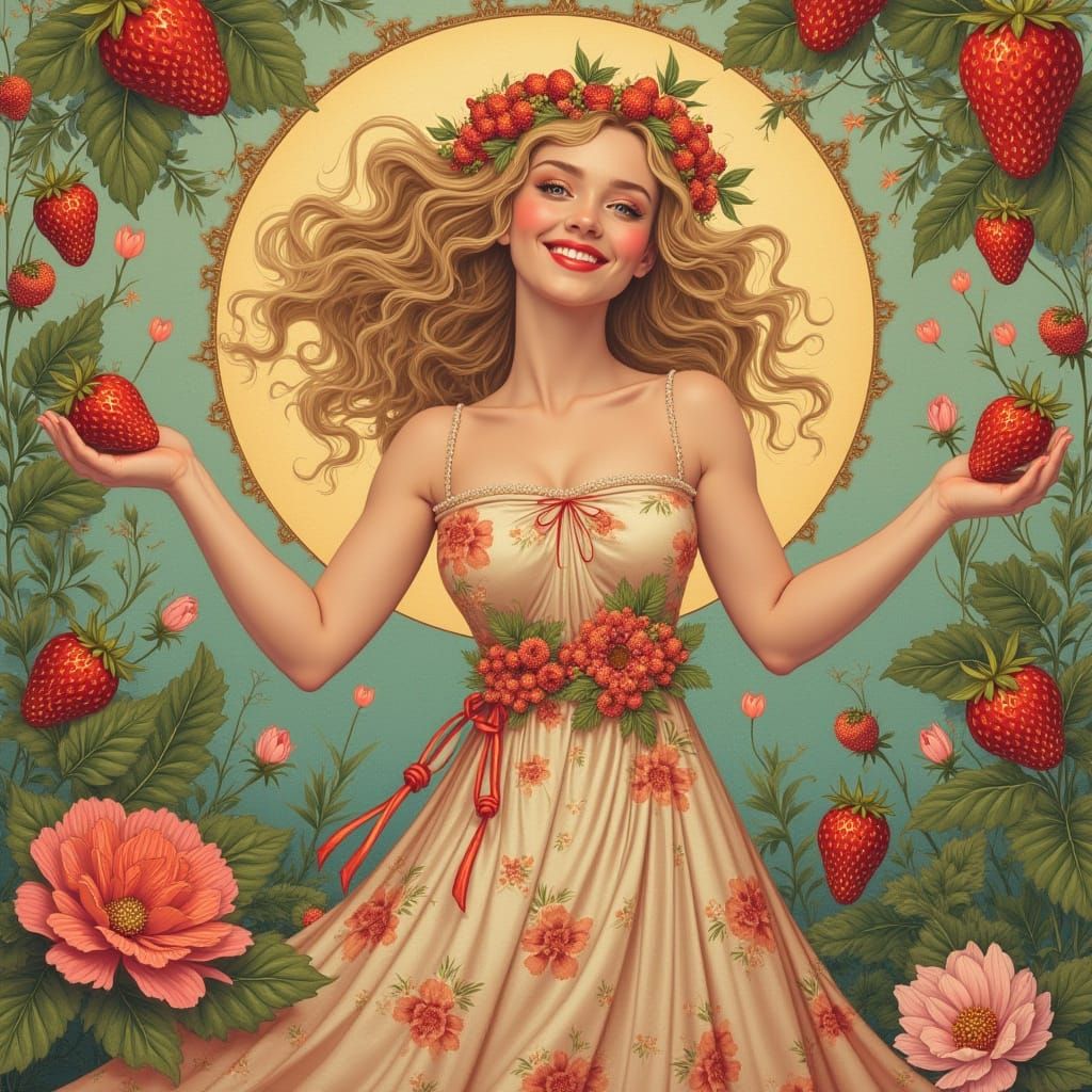 This image shows a smiling European woman dancing with strawberries, wearing a delicate mousseline dress with a floral motif, set against a backdrop of organic curves and lines, in a style reminiscent of Art Nouveau and soft pastel colors.