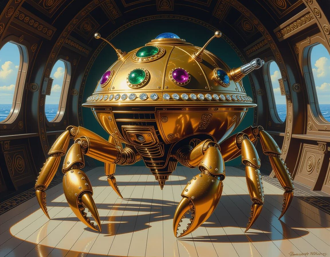This image shows a biomechanical, crab-legged robot striding across the bridge of a spacecraft. The robot has pincers and is covered in gems, rendered as a hyperrealistic oil painting.