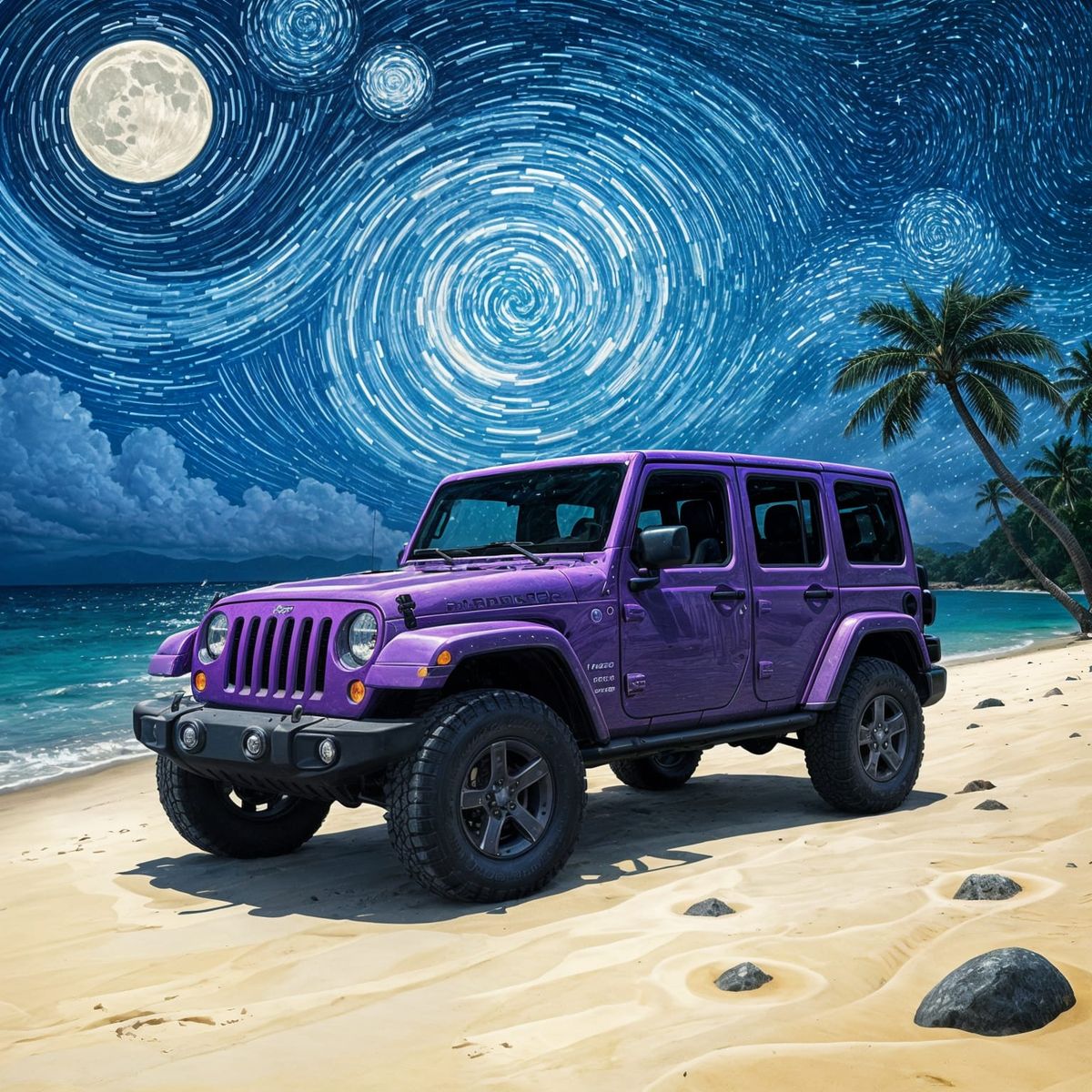 A vibrant image of a purple Jeep Wrangler on a tropical beach under a starry night sky. The scene is reminiscent of Van Gogh's artistic style.