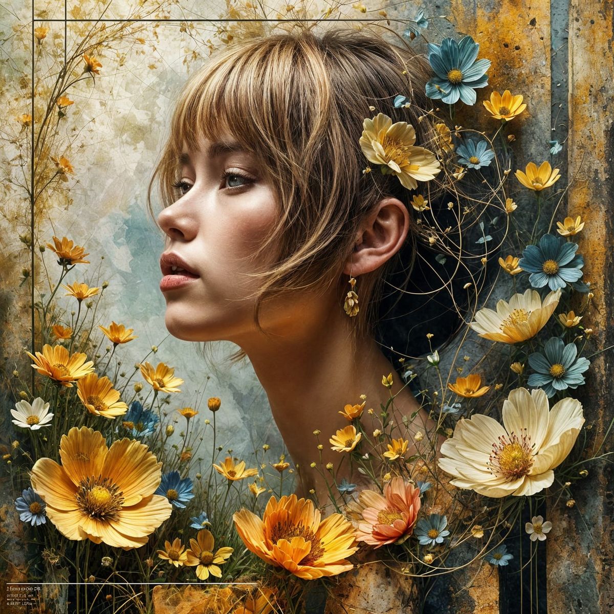 A layered portrait of a blond woman in a dreamlike landscape. Wildflowers and musical notation intertwine with geometric patterns in this softly illuminated and sensuous scene.