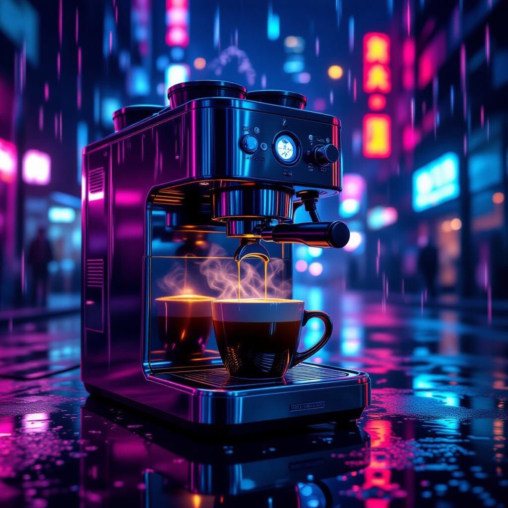 Easily generate your own cyberpunk coffee machine images with AI. Free and fun!