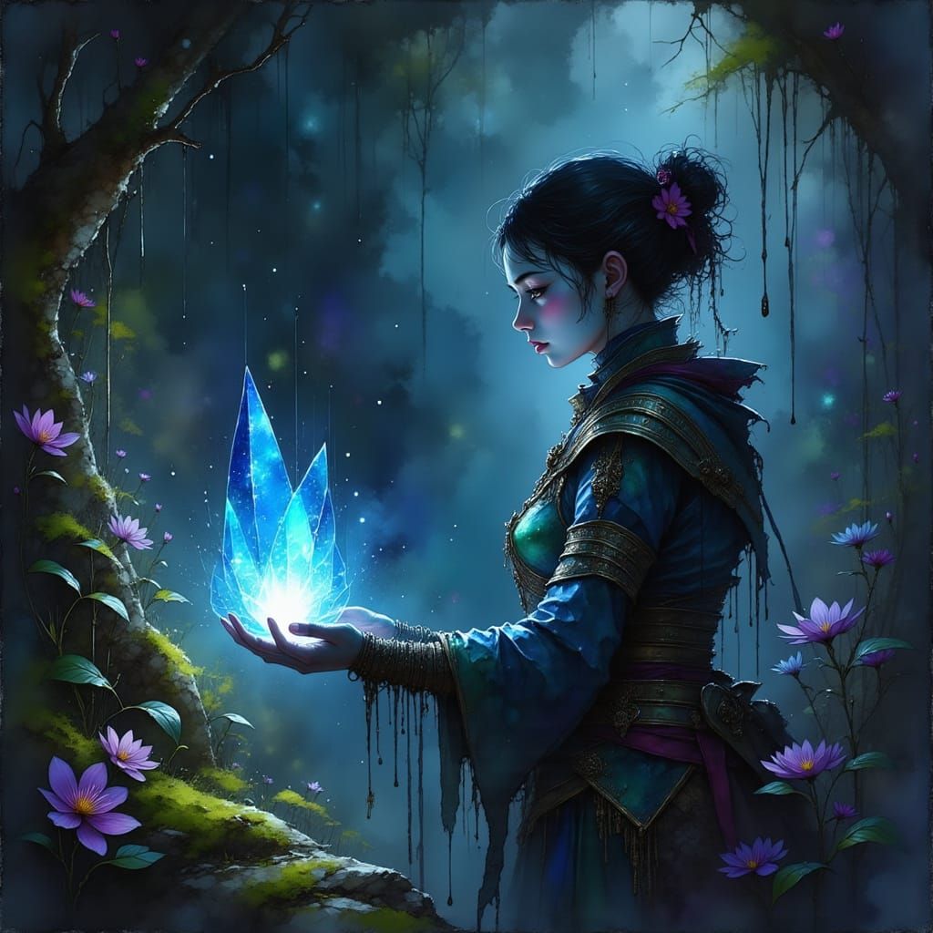 A striking picture of a lone fae warrior in a hidden glade. She carries a shard of dark crystal, her eyes shining. Intricate armor and soft light define this dark fantasy scene.