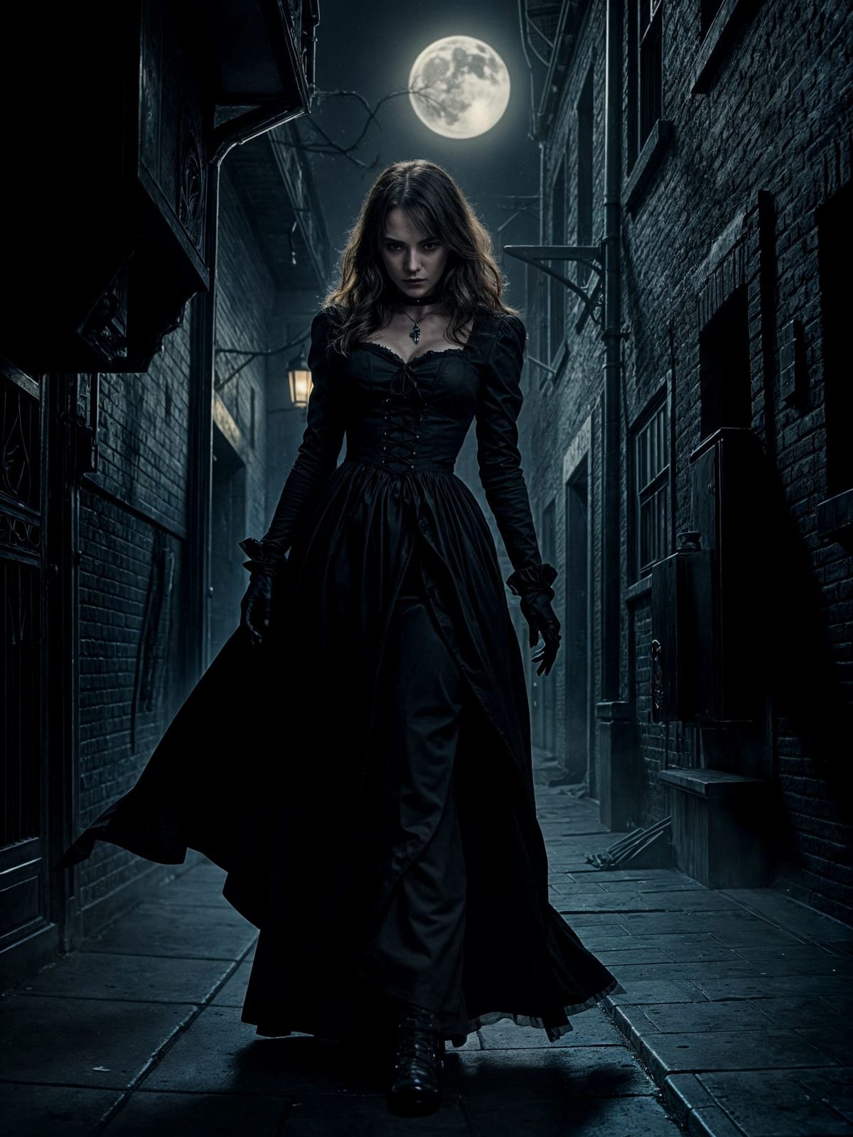 This image shows a female vampire as she hunts her next victim. The scene captures a suspenseful moment filled with dark undertones and gothic horror elements.