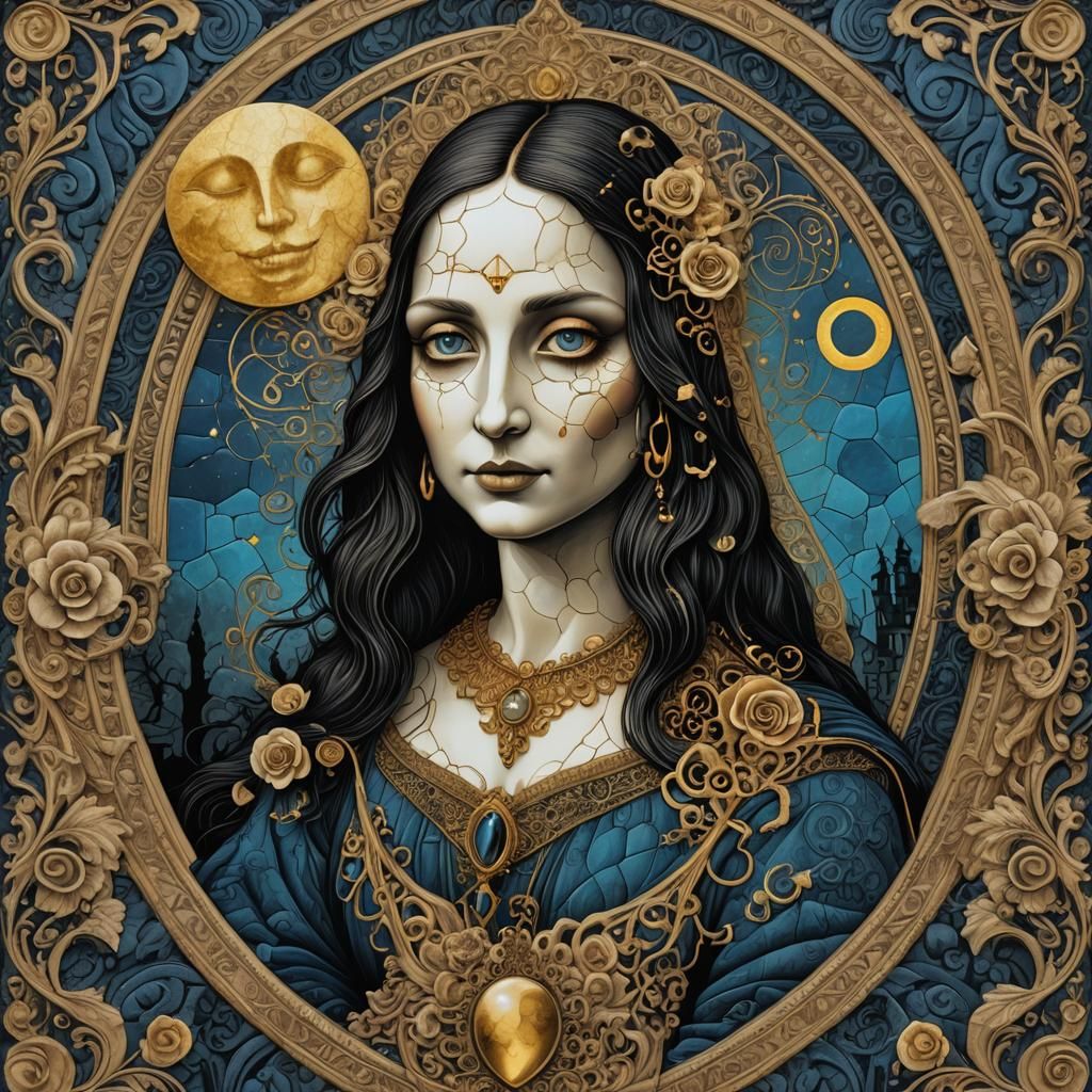 A whimsical ink illustration of a stone heart. Dancing ghosts, black cats, and skeletons are illuminated by a golden moon. The image is an ornate, surreal digital artwork.