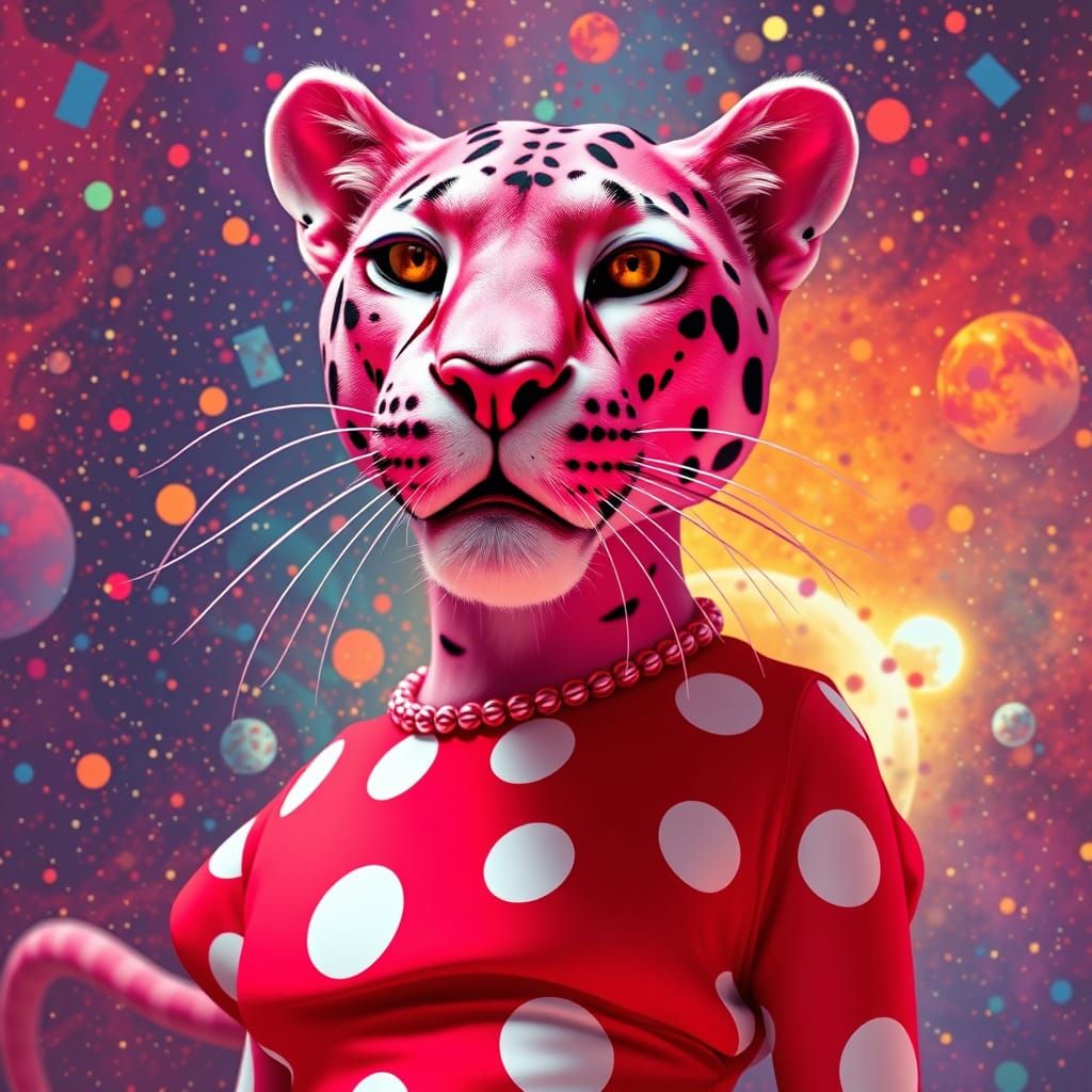 A vibrant image of the Pink Panther in a red Spanish dress. The artwork evokes a 1970s comic book aesthetic, featuring vivid colors and dynamic textures in a celestial setting.