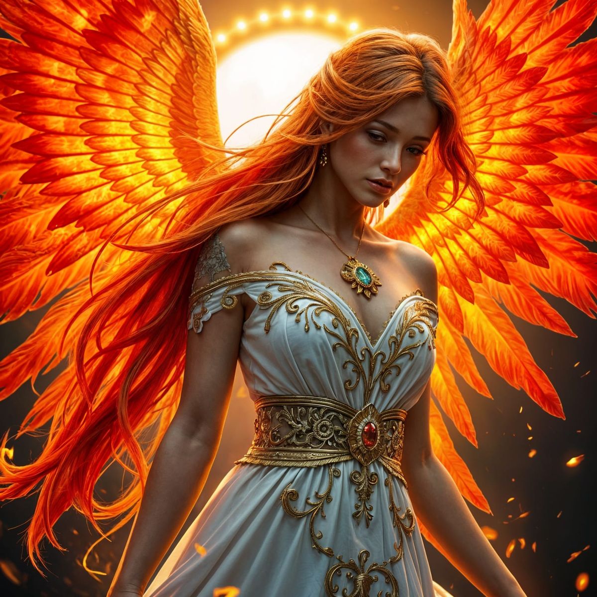 This image shows a beautiful phoenix-angel woman with blazing wings and flowing red-orange hair. The figure wears an ornate white dress with golden filigree, rendered with cinematic lighting and fine details as digital art.