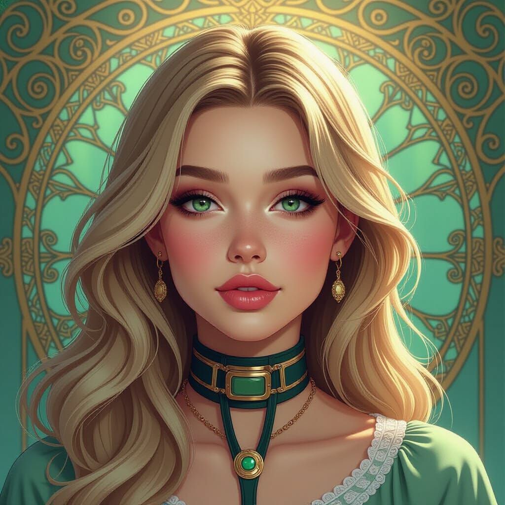 This hyperrealistic portrait features a young woman with blond hair and green eyes, detailed with a tracheotomy tube. The art nouveau background uses golds, teals, and greens, with dynamic lighting.