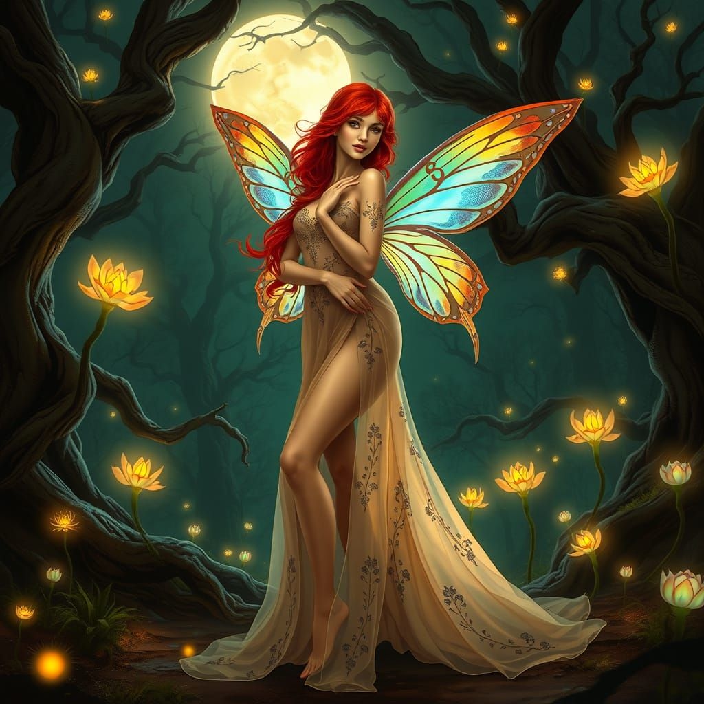 A beautiful fairy with red hair and colorful wings stands in a moonlit forest. The image captures the scene with soft light and shadows, in an art nouveau style.