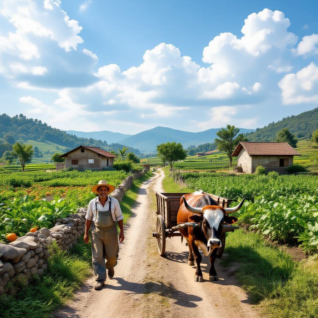 This image shows a vibrant countryside scene with cottages, farms, and orange groves. A farmer and bull pull a wooden cart along a dirt road, under a bright blue sky filled with clouds.