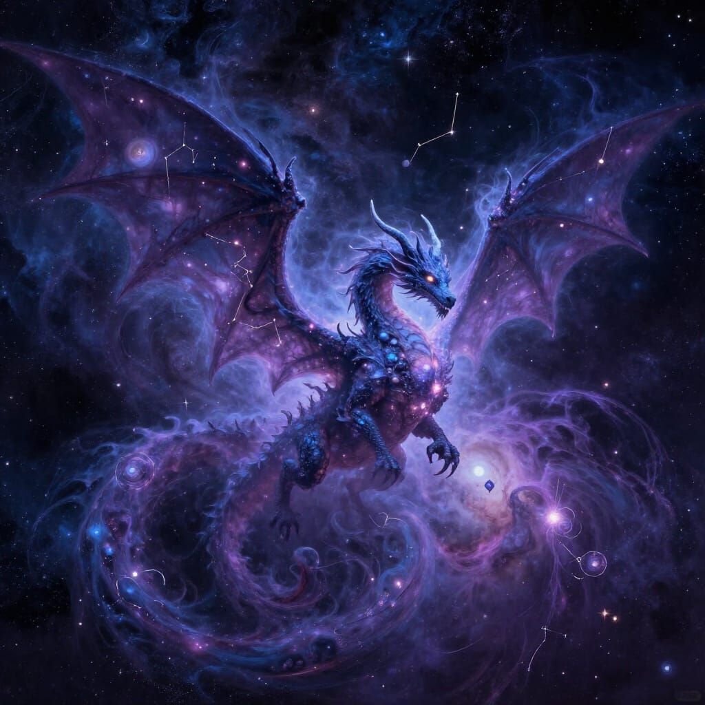 This image shows a majestic cosmic dragon made of swirling nebulae and stars. Its wings spread across constellations, with glowing celestial bodies and galaxy-bright eyes, rendered in ethereal fantasy art.