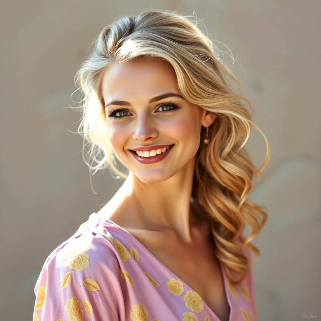 A bright and airy portrait of a smiling European woman, wearing a delicate pastel-colored dress with floral motifs, set against a sunny and luminous background, reminiscent of Impressionist masterpieces.