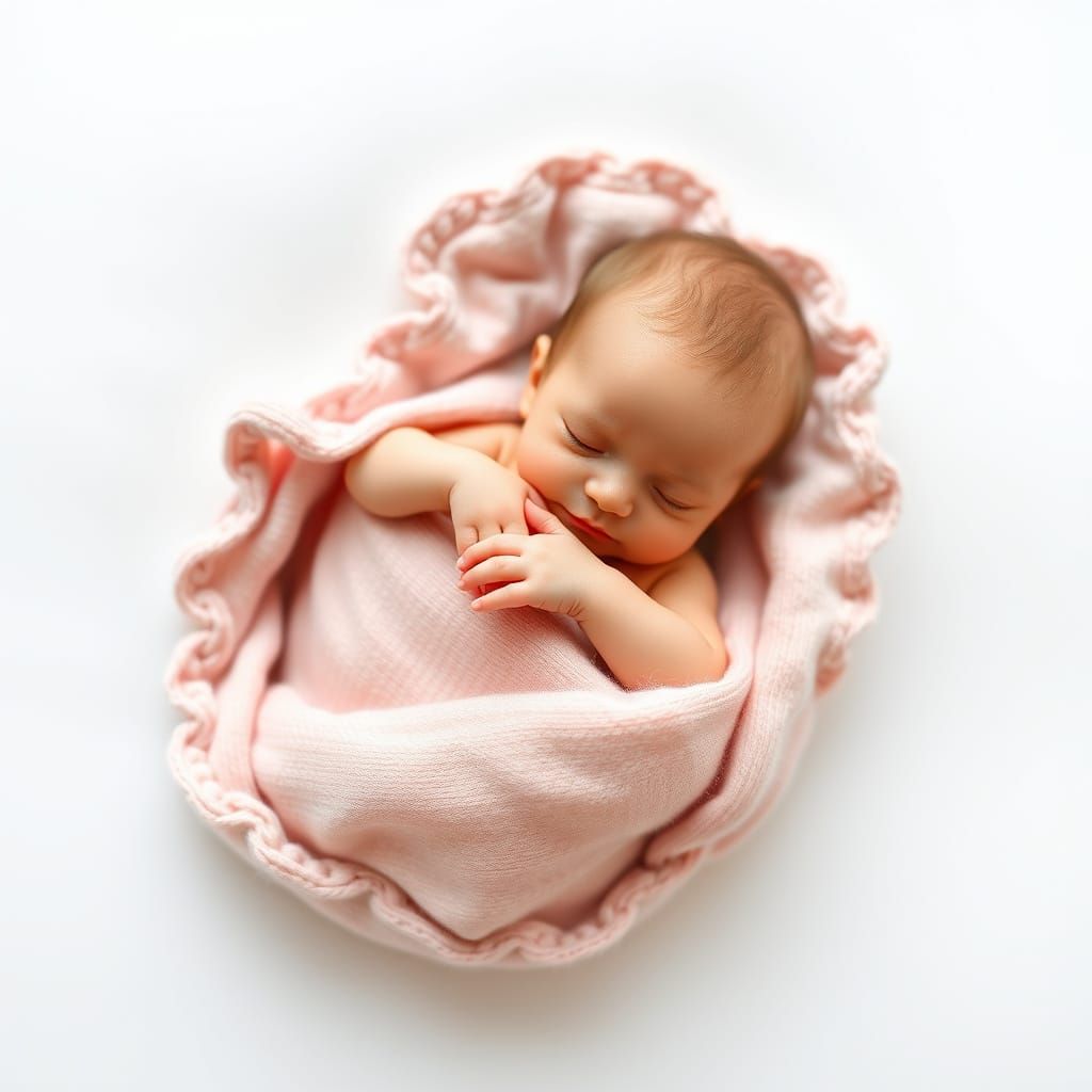 This image features a newborn baby nestled in a soft, pastel-colored blanket, surrounded by a minimalist white background, evoking a sense of nostalgia and wonder, reminiscent of Playmobil toys and whimsical children's art.