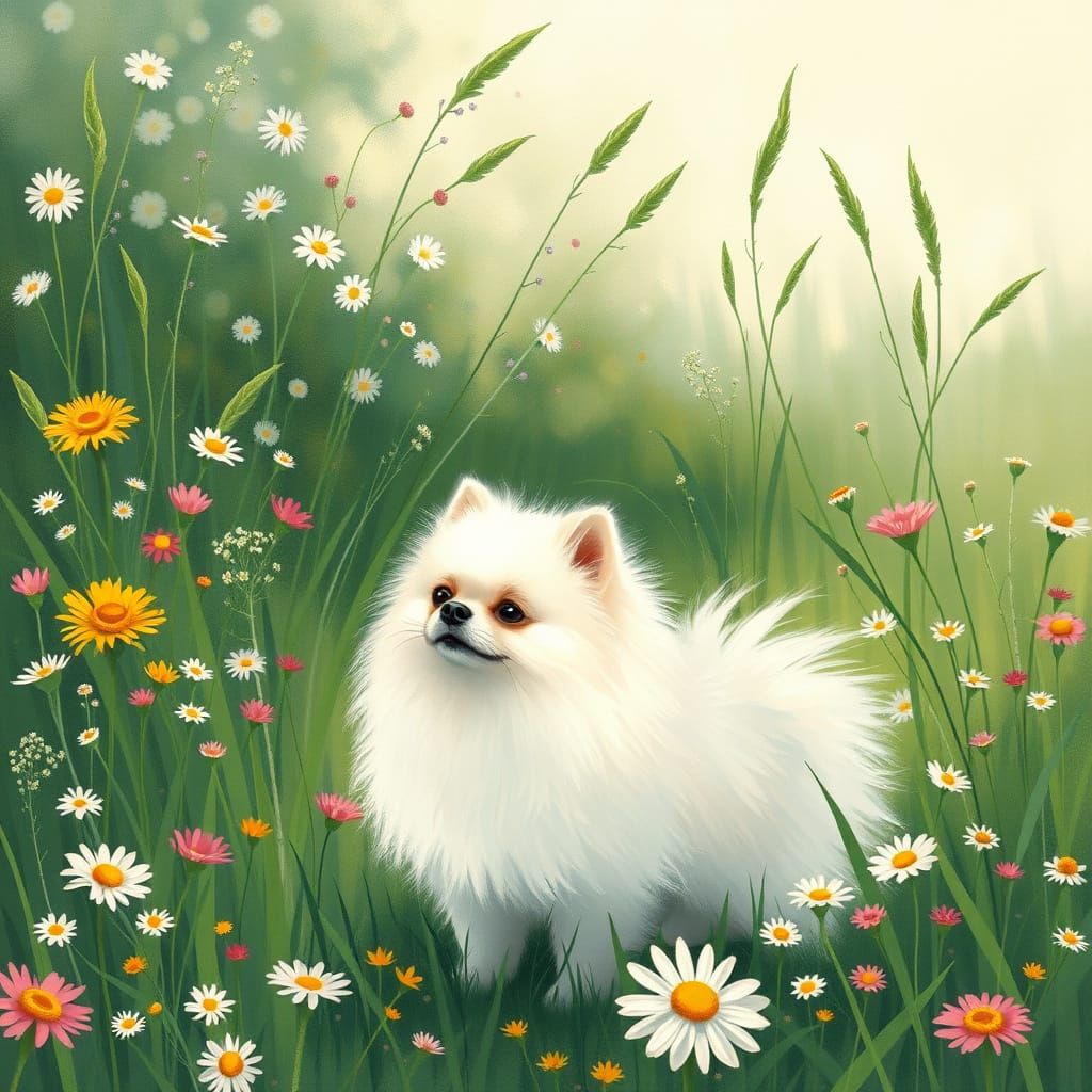 This image depicts a fluffy white Pomeranian standing in a lush, vibrant green meadow filled with blooming wildflowers, evoking the impressionist style of a serene landscape painting.
