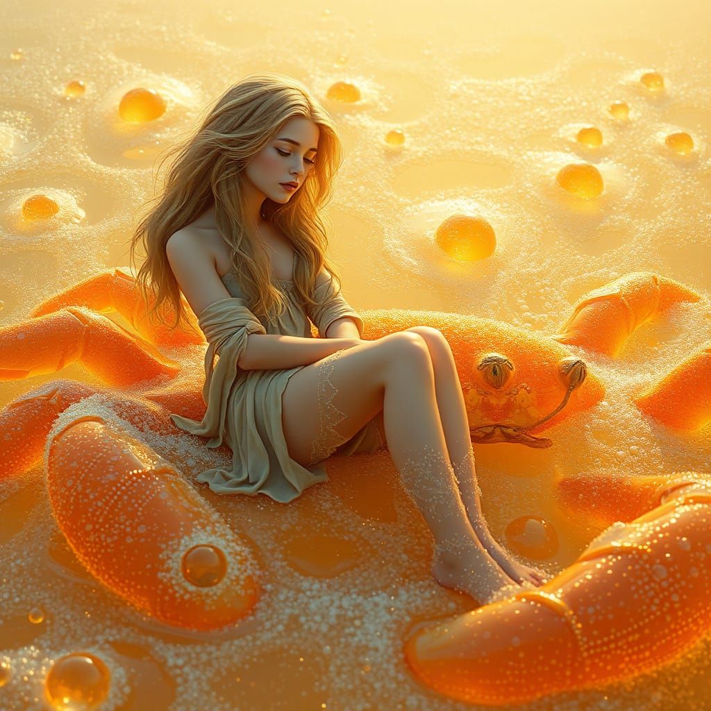 A digital artwork presents a serene woman with golden hair, seated on a colossal gummy crab. She's amidst a fizzy soda sea, all rendered in warm, amber hues with intricate textures, creating an enchanting surreal scene.