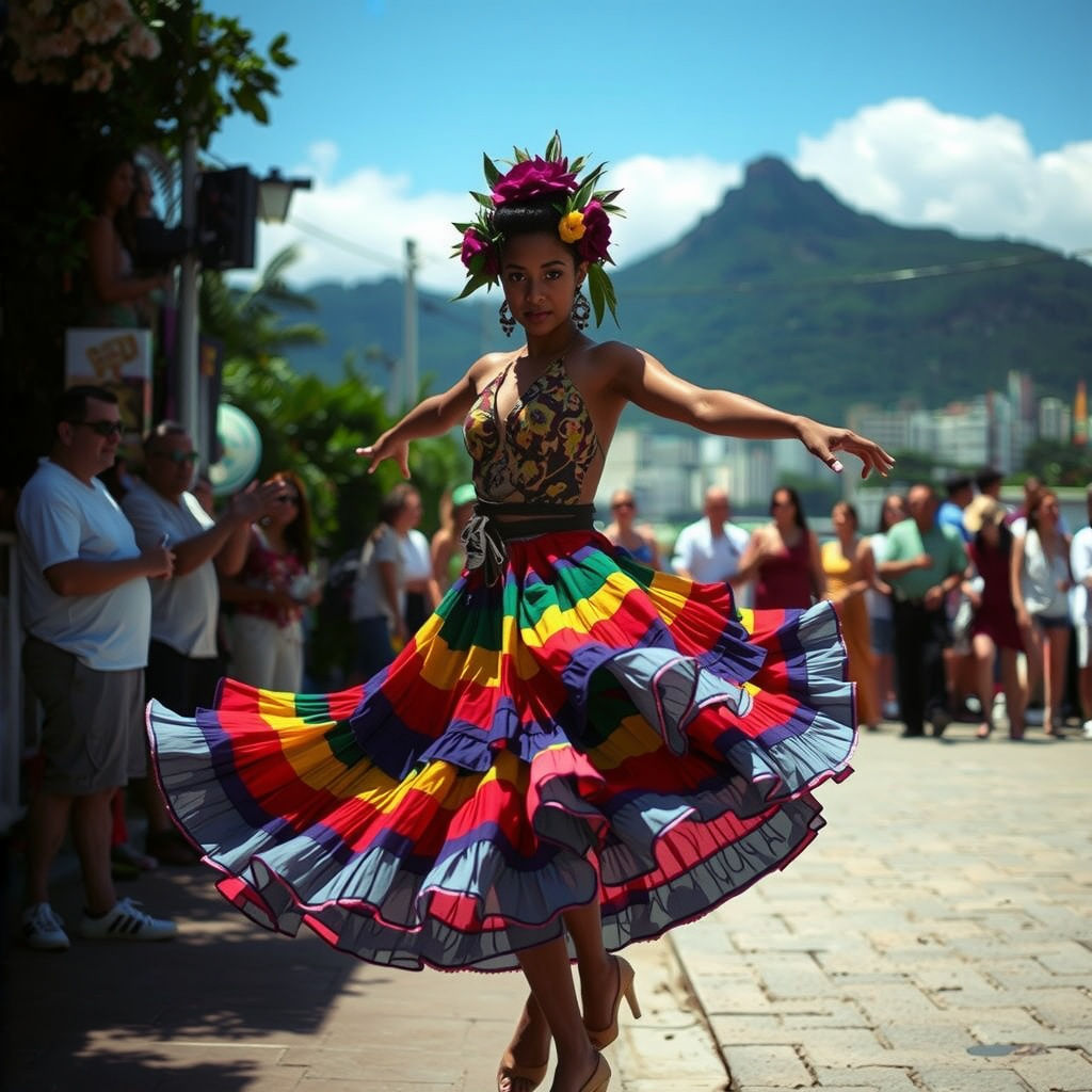 This image depicts a dancer in a vibrant dress performing in Rio de Janeiro. The picture uses a double exposure effect to capture the energy of Brazil.