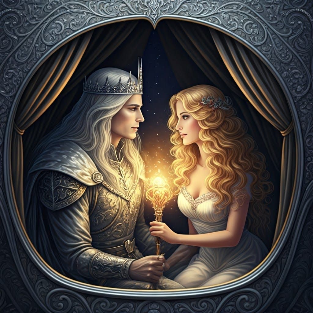A romantic scene of a silver king and a lovely blonde in a cozy, dimly lit chariot, surrounded by the mystery of a dark night, in a style reminiscent of Art Nouveau and fantasy art.