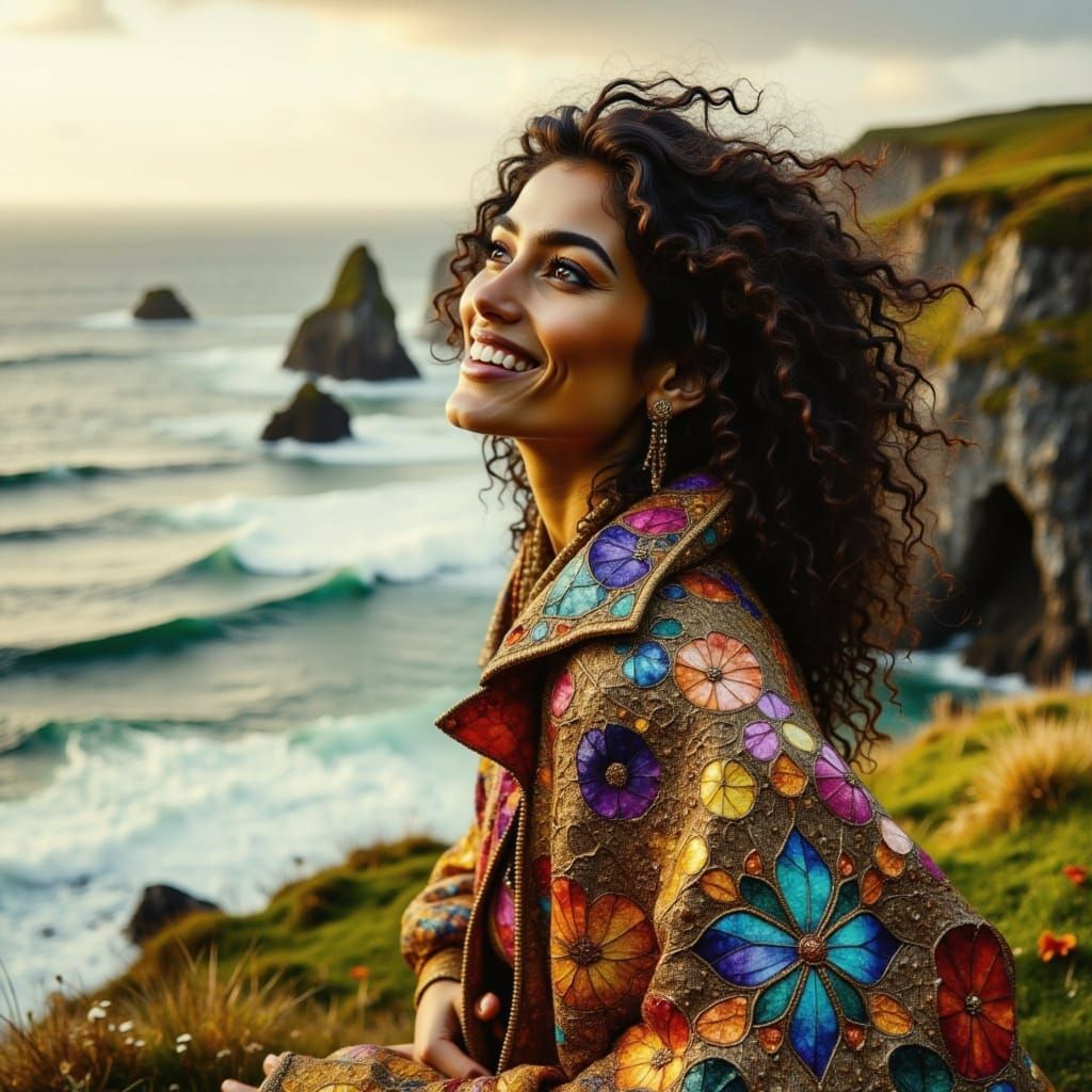 This image depicts a joyous Italian woman standing at the Cliffs of Moher in Ireland, surrounded by the ocean and vibrant sunshine. The scene is captured in intricate detail, with contrasting colors and dynamic lighting creating a serene and expansive seascape.