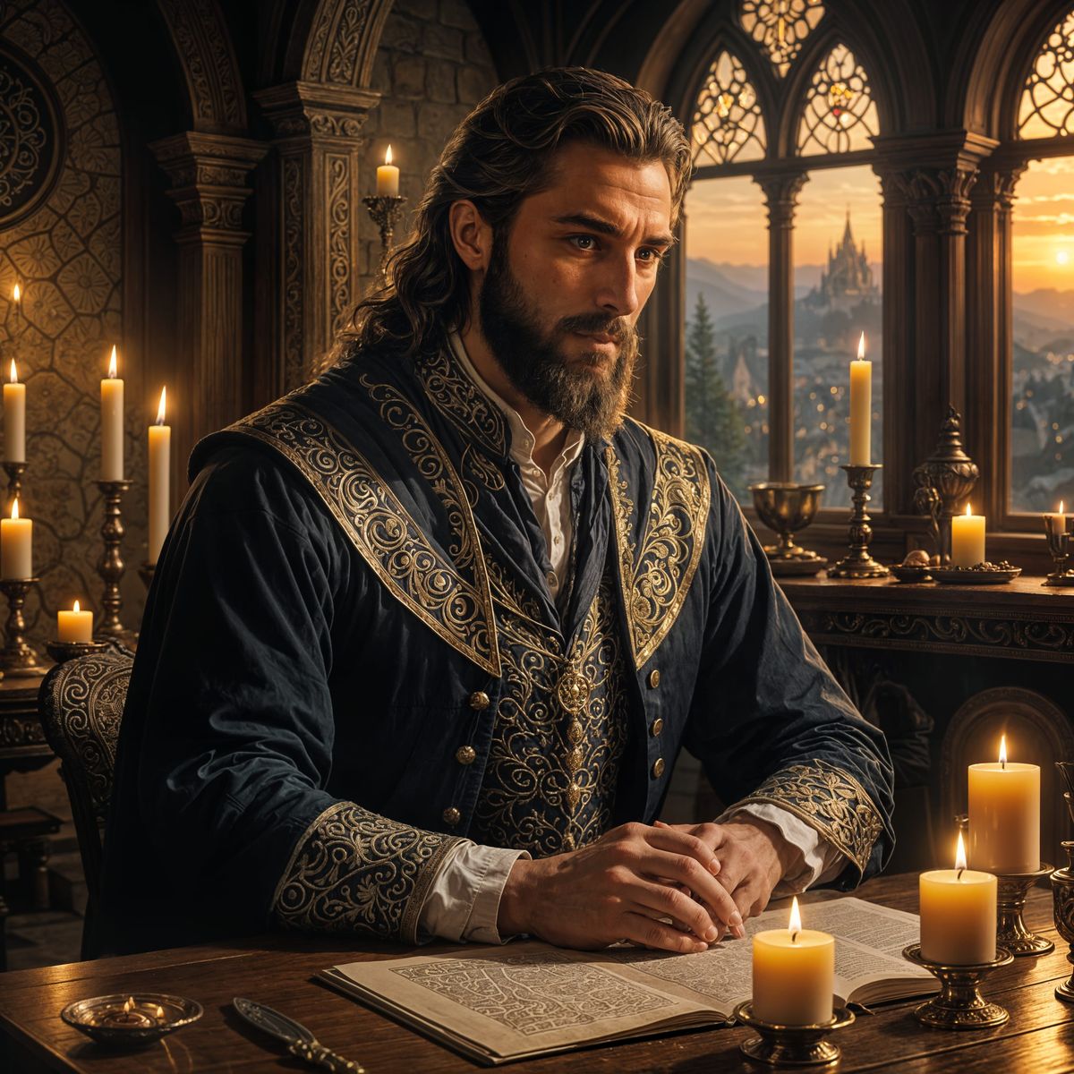This image shows a man with a detailed beard sitting at a candlelit table. The graphic art features stark sunrise lighting and golden hour effects, reminiscent of a fantasy painting.