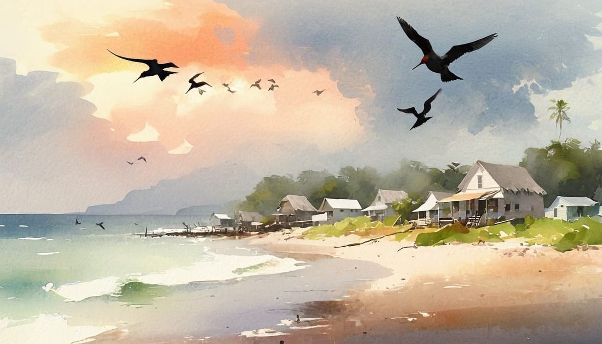 A watercolor-style image of a quaint beach village featuring thatched-roof bungalows and a general store, reminiscent of classic American watercolor paintings. Frigate birds soar above in soft sunlight.